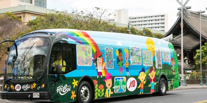 Travel Plaza Transportation has introduced the first 100% battery powered electric buses in the State of Hawaii. This Clean technology helps us to reduce Oahu's air pollution. TPT collaborated with the Blue Planet Foundation and local schools on designing the bus wrapping, with 3 unique designs.